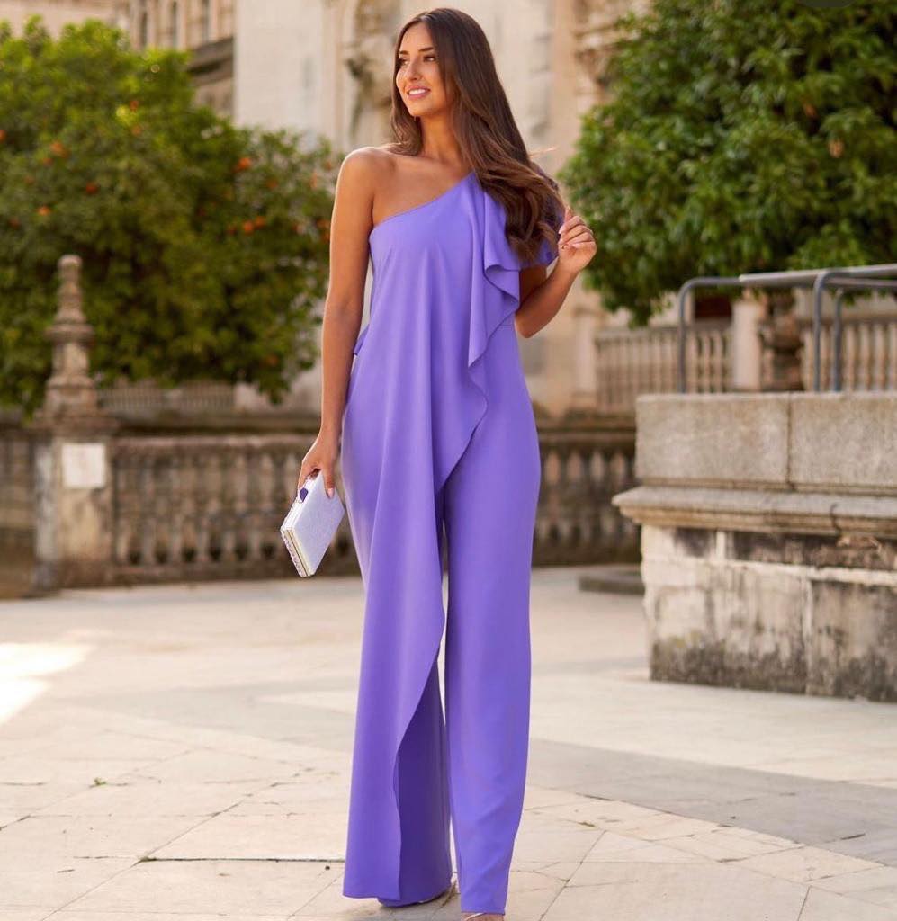 Tuta monospalla VIOLA con pantaloni a gamba larga, impreziosita dalla scollatura monospalla di grande tendenza. Per essere sempre impeccabile ad ogni occasione.